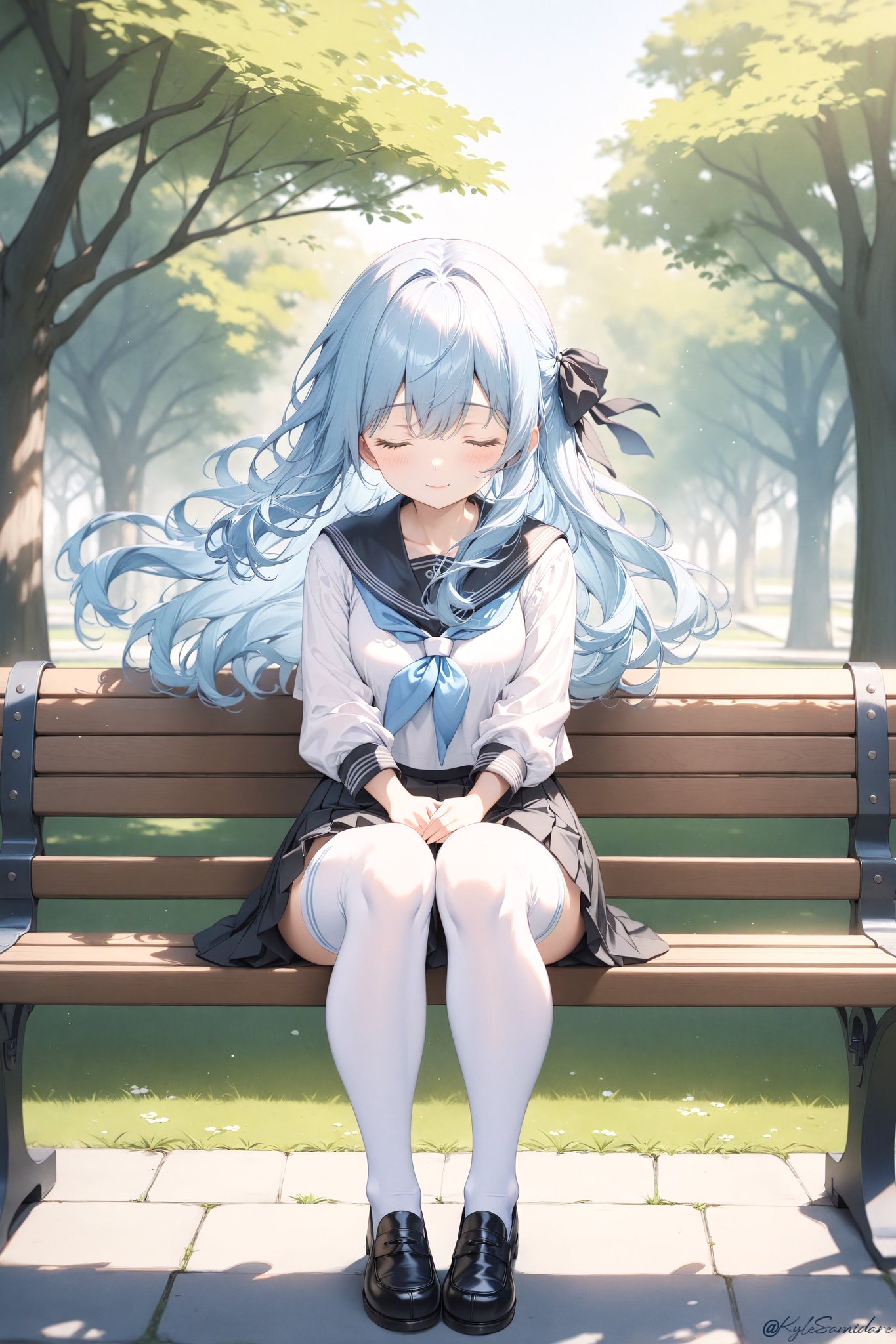 五月雨ちゃん 私(みあにゃん)を描いてくれてありがとうございます⭐️ 天気のいい公園で気持ちよく寝ていてる私がとっても可愛いです💙 髪の毛が靡いて白のニーソとセーラー服姿素敵なのです🥰